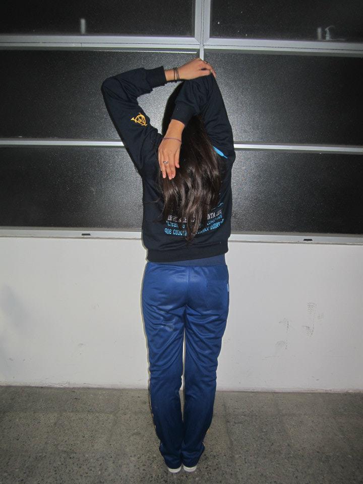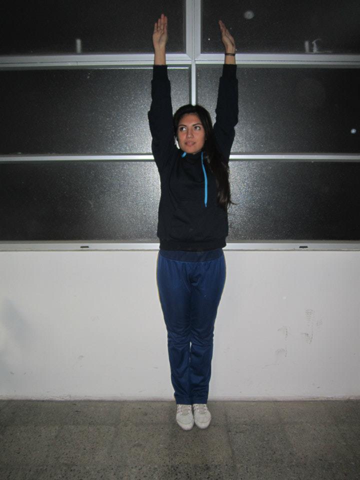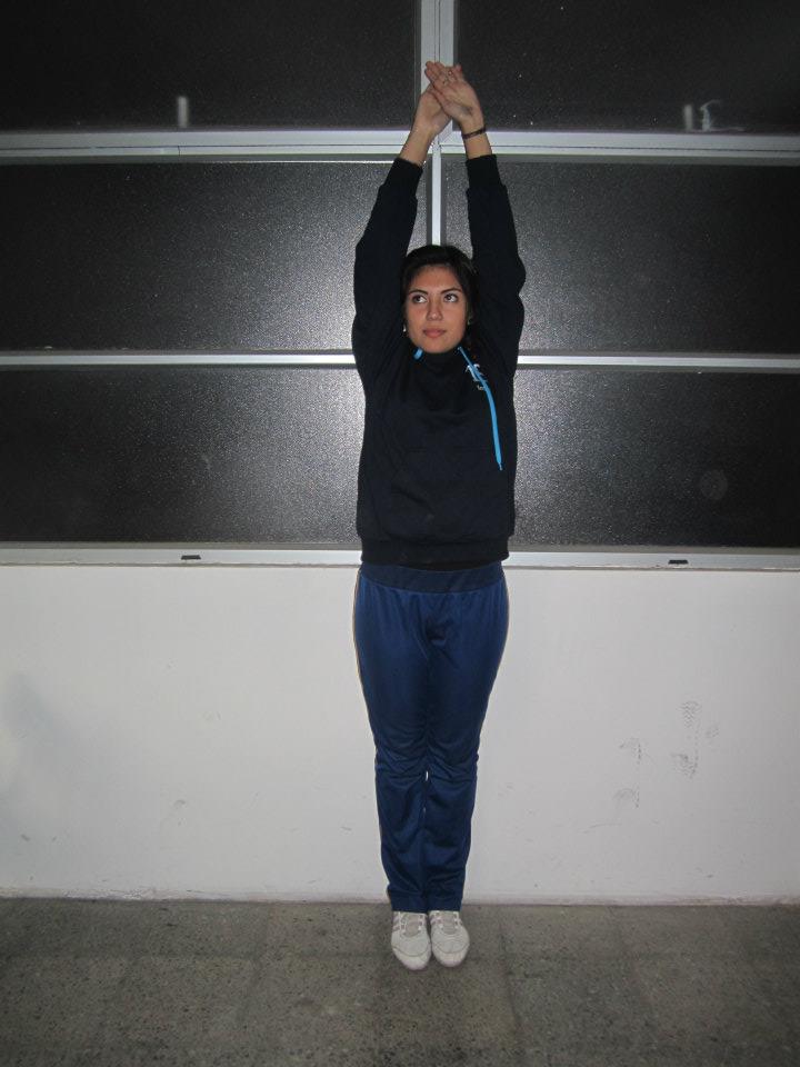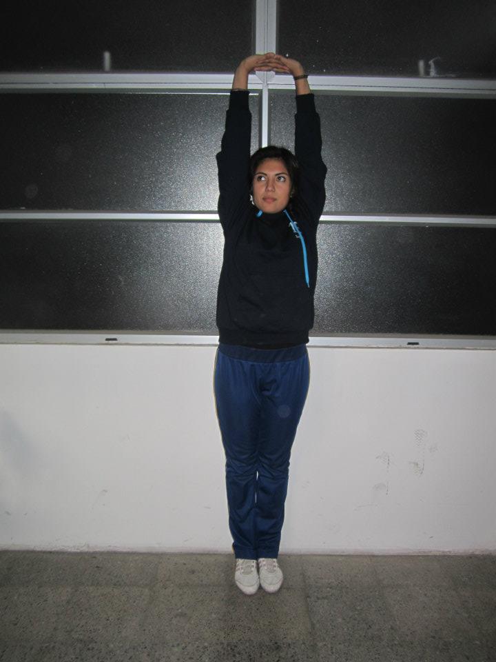 - De pie, elevas tu brazo derecho por detras de tu cabeza y con tu mano izquierda tomas tu mano derecha por la espalda y mantienes.