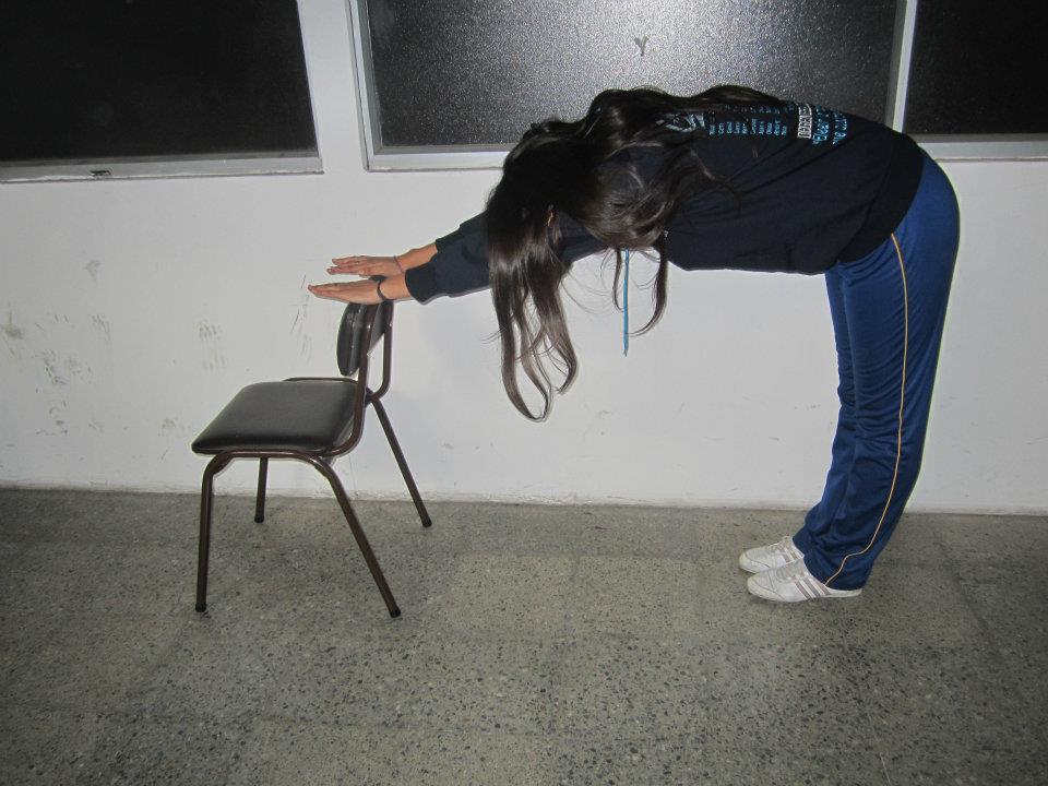 - Flexionando el tren superior hacia delante estiras las manos y las apoyas sobre una silla, inclinando la cabeza y sin flexionar las rodillas.
